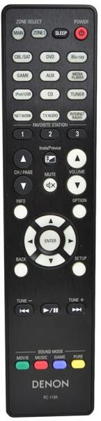 Az eredeti 1:1 arányú duplikátuma távirányító DENON RC-1184 (RC1184). A távirányító a DENON:AVR-X3000, AVRX3000. (Előfordulhat, hogy nem minden kompatibilis modell szerepel a listában. Ha nem biztos benne, csak adja meg a készülékmodelljét (online chat-en vagy e-mailben), és mi azonnal ellenőrizzük, if kompatibilis-e az Ön készülékével. Az ellenőrzött kompatibilitást mi