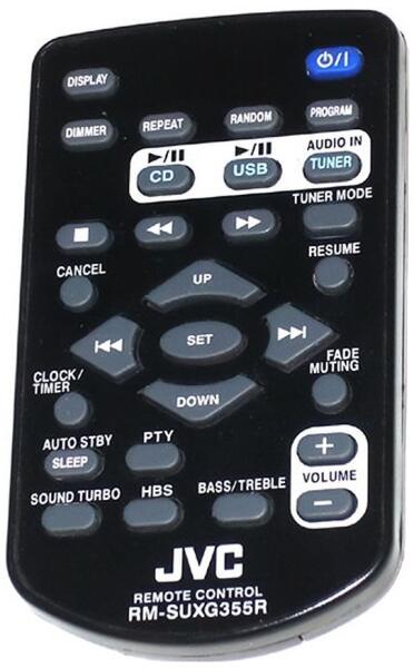 Az eredeti 1:1 arányú duplikátuma távirányító JVC RM-SUXG355R (RMSUXG355R). A távirányító a JVC:UX-G355, UX-G355B, UX-G357, UX-G375, UX-G377, UX-G395, UX-LP5. (Előfordulhat, hogy nem minden kompatibilis modell szerepel a listában. Ha nem biztos benne, csak adja meg a készülékmodelljét (online chat-en vagy e-mailben), és mi azonnal ellenőrizzük, if kompatibilis-e az Ön készül