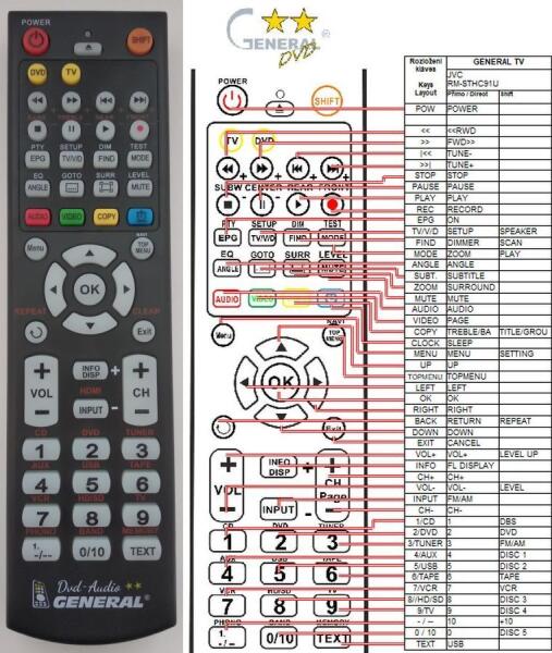 Helyettesítő távirányító JVC RM-STHC91U (RMSTHC91U) - 100%-os 1:1 arányú helyettesítője az eredeti távirányítónak. A távirányító a JVC:RM-STHC91U, RMSTHC91U. (Előfordulhat, hogy nem minden kompatibilis modell szerepel a listában. Ha nem biztos benne, csak adja meg a készülékmodelljét (online chat-en vagy e-mailben), és mi azonnal ellenőrizzük, if kompatibilis-e az Ön k