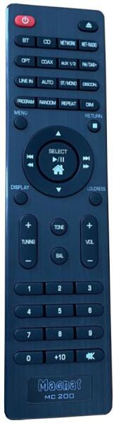 Helyettesítő távirányító MAGNAT MC 200 - 100%-os 1:1 arányú helyettesítője az eredeti távirányítónak. A távirányító a MAGNAT:MC 200, MC200. (Előfordulhat, hogy nem minden kompatibilis modell szerepel a listában. Ha nem biztos benne, csak adja meg a készülékmodelljét (online chat-en vagy e-mailben), és mi azonnal ellenőrizzük, if kompatibilis-e az Ön készülékével. Az