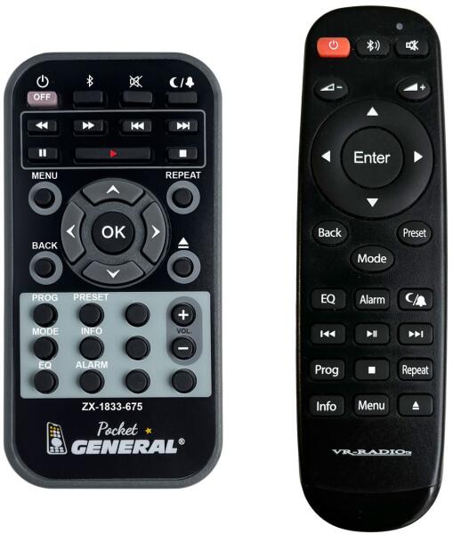 Az eredeti 1:1 arányú duplikátuma távirányító VR-RADIO ZX-1833-675 (ZX1833675). A távirányító General POCKET duplicate pontosan ugyanazokkal a funkciókkal és gombnevekkel rendelkezik mint az eredeti távirányító. Nincs szükség beállításra és nincs szükség kódokra, csak helyezze bele az elemeket, és máris használható a fent felsorolt modellekkel. A távirányító ebben