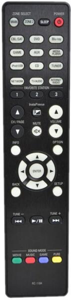 Vadonatúj helyettesítő távirányító DENON RC-1184 (RC1184). A távirányító a DENON:AVR-X3000, AVRX3000. (Előfordulhat, hogy nem minden kompatibilis modell szerepel a listában. Ha nem biztos benne, csak adja meg a készülékmodelljét (online chat-en vagy e-mailben), és mi azonnal ellenőrizzük, if kompatibilis-e az Ön készülékével. Az ellenőrzött kompatibilitást mi garantálj