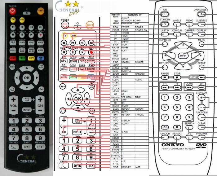 Helyettesítő távirányító ONKYO RC-449DV, RC-450DV (RC449DV, RC450DV) - 100%-os 1:1 arányú helyettesítője az eredeti távirányítónak. A távirányító a ONKYO:DV-S555, DV-S757, DV-SP500, DVD-S155, DVD-S555. (Előfordulhat, hogy nem minden kompatibilis modell szerepel a listában. Ha nem biztos benne, csak adja meg a készülékmodelljét (online chat-en vagy e-mailben), és mi azonnal