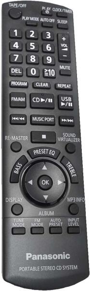 Az eredeti 1:1 arányú duplikátuma távirányító PANASONIC N2QAYA000008. A távirányító a PANASONIC:RX-D50, RX-D55A, RXD50, RXD55A. (Előfordulhat, hogy nem minden kompatibilis modell szerepel a listában. Ha nem biztos benne, csak adja meg a készülékmodelljét (online chat-en vagy e-mailben), és mi azonnal ellenőrizzük, if kompatibilis-e az Ön készülékével. Az ellenőrzött komp