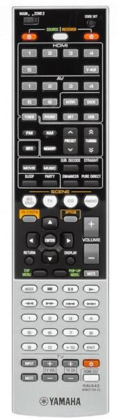 Helyettesítő távirányító YAMAHA RAV443, RAV444 - 100%-os 1:1 arányú helyettesítője az eredeti távirányítónak. A távirányító a YAMAHA:RX-V771, RX-V781, RXV771, RXV871. (Előfordulhat, hogy nem minden kompatibilis modell szerepel a listában. Ha nem biztos benne, csak adja meg a készülékmodelljét (online chat-en vagy e-mailben), és mi azonnal ellenőrizzük, if kompatibilis-e