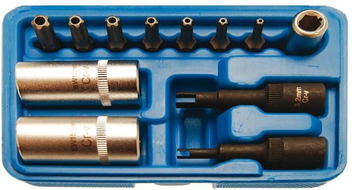 a légkondícionáló rendszer szerelvényeihez minden szerszámot tartalmaz hasznos kiegészítés a #8036-hoz speciális dugókulcsok 2,2 és 3,2 mm-es szabályzó szelephez 2 speciális 8 lapú dugókulcs 12 és 15 mm TS (5-csillag profil) bit a hűtő meglazításához TS10 TS15 TS20 TS25 TS27 TS30 TS40
