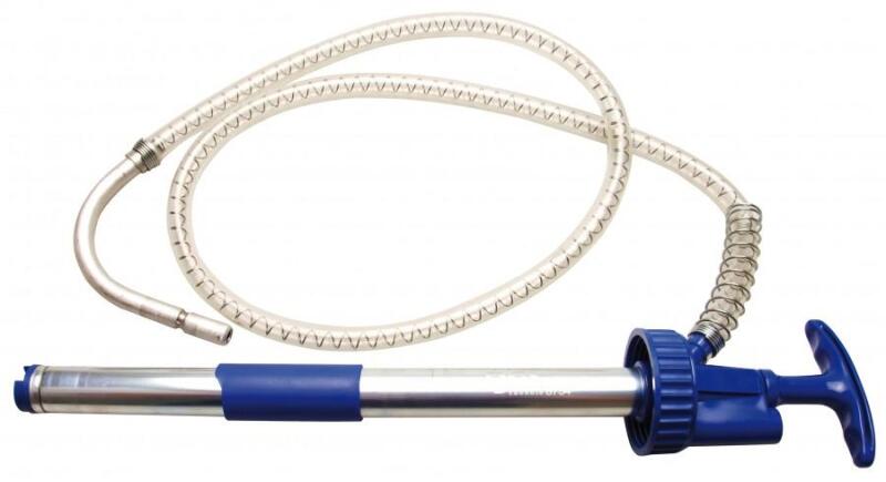 műanyag hordóból történő folyadék átvitelhez csavaros csatlakozással 56,5 - 58,5 mm alkalmas olajhoz hűtőfolyadékhoz stb. 50" olajellenálló hajlékony csővezeték nem cseppenő kiöntővel és visszafolyó kiöntő tartóval ön-feltöltős lefelé nyomó stílusú pumpa szívócső hossza: 325 mm kapacitása: 60 cm3/löketenként max. folyadék hőmérséklet: 140o F (60o C)