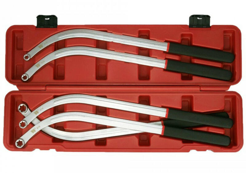 Ékszíjszerelő kulcs készlet 5 darabos kiszerelésben. Úgy tervezték, hogy eltávolítsa a csavarokat az öv és a feszítőgörgőknél. A motortérben lévő kényelmetlen, nehezen hozzáférhető területeken könnyedén használható. Méretek: E10, E12, E14, E16, E18 Hosszúságuk: 460 mm Súly: 3 kg Szín: ezüst-fekete Anyag: acélötvözet