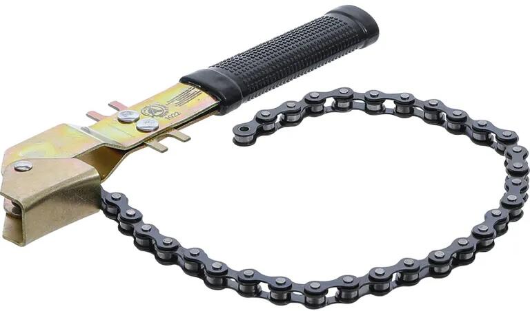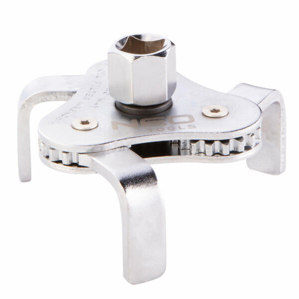 NEO olajszűrőkulcs profi szervizek és autószervizek számára, valamint haladó amatőrök számára. Fémházas külső olajszűrők hatékony és helyes beszereléséhez tervezett kulcs. A kulcs lapos pofákkal rendelkezik. Háromkaros szerkezet. 64 és 100 m közötti átmérőjű szűrőkhöz alkalmas. A készlet 3/8" és 1/2" redukciót tartalmaz. Olajszűrő leszedő (64-100mm), adapter