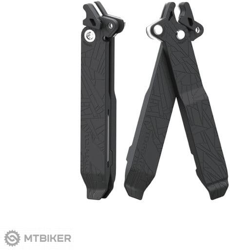 Ötletesen megtervezett könnyű multifunkcionális szerszám - a korábbi POWER LEVER modell újabb, nagyobb és acél erősítésű változata . Két rögzítőkar a gumiabroncsok le- és felhelyezéséhez egyszerű fogóvá válik a legelterjedtebb típusú/típusú kerékpárláncok összekötő elemeinek szét- és összeszereléséhez . beépített rozsdamentes acél lánchorog a jobb kezelh