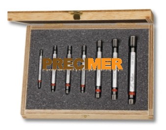 Kétoldalas dugós menetidomszerek készletben. (megy és nem megy oldal) A készlet 7db kétoldalas dugós menetidomszert tartalmaz: M3 6H, M4 6H, M5 6H, M6 6H, M8 6H, M10 6H, M12 6H. Tűrések és méretek a DIN ISO 1502 szerint. Nem megy oldal pirossal jelölve.