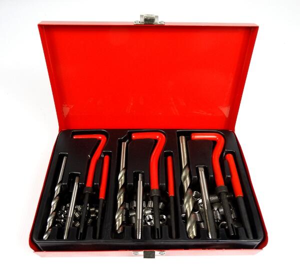 Menetjavító készlet 88 db88-részes menetjavító készlet sérült, törött menetek javításához, klasszikus M6 - M10 méretekkel. A javítás a sérült menet átfúrásából és az új menet bevágásából áll, amibe belecsavarozható egy rugó alakú speciális betét, aminek a belső menete a csavarozás után megegyezik a szükséges menettel. A készlet használható alacsony szil