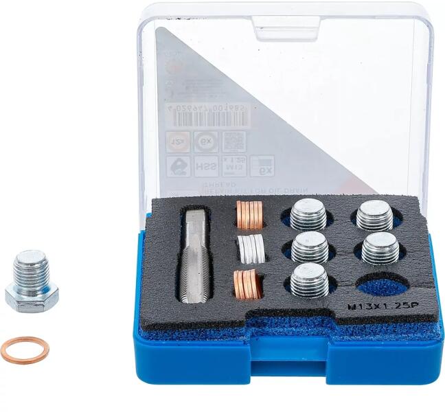 A javítókészlet olajleeresztő csavarmenethez egy hasznos eszköz, amely segít a sérült csavarmenetek helyreállításában. Méret: M13 x 1,25 mm Készlet tartalma 1 db menetfúró HSS-G acélból 6 db pótcsavar 12 db réz tömítőgyűrű 6 db alumínium tömítőgyűrű Brutt ó súly: 268 g
