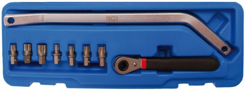az ajtózsanérok szét- és összeszereléséhez de alkalmas más munkálatokhoz is ahol kevés a hely beleértve a következő bit készlet rögzítő golyóval: spline csavarokhoz M8 M10 M12 hajlított bit csavarkulcs valamint T-Star csavarokhoz T30 T40 T45 T50 megfordítható racsnis kulcs