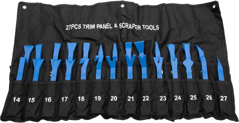 Leírás A 27 db-os Panel- és kárpiteltávolító készlet széles körben használható eszközkészlet, amely ideális a járművek belső elemeknek, mint a műszerfalak, szellőzőnyílások, ajtólapok, ajtózárak, elektronikus ülésvezérlők és egyéb elemek szétszereléséhez. A készlet tartalmazza a leggyakrabban használt eszközöket, amelyek különböző méretűek és alakúak,