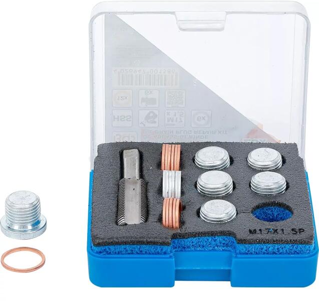 A Javítókészlet olajleeresztő csavarmenethez egy hasznos szerszámkészlet, amelyet a sérült olajleeresztő csavarok javítására terveztek. Ez a készlet lehetővé teszi a csavarmenetek helyreállítását, így megakadályozza az olajszivárgást és biztosítja a megfelelő tömítést. Specifikáció Méret: M17 x 1,5 mm méretű csavarmenetekhez Készlet tartalma 1 db menetfúró, HSS
