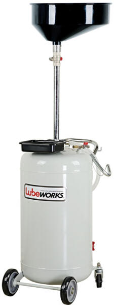 Lube Works Olajleeresztő tartály 90 Literes komplett olajleeresztő. Alkalmas a motor, sebességváltó, differenciáltművek fáradt olajának leeresztéséhez. Állítható magasságú gyűjtőtál. Maró hatású vagy gyúlékony termékekkel nem használható. Sűrített levegővel üríthető a megtelt tárolótartály. A tartály oldalán szerszám/alkatrész tároló tálca és telítetts