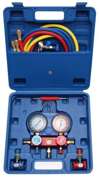 Termékadatok: Magas és alacsony nyomású tömlőt és csatlakozótömlőt tartalmaz a szervizberendezésekhez A mérőműszerek alumínium házban vannak elhelyezve Elzárószelepek a magas és alacsony nyomáshoz Ha a gyorscsatlakozókat nem használják a légnyomást biztosító tömlőkön, akkor azok az oldalsó vakcsatlakozókhoz rögzíthetők a védelem érdekében akasztóval Tömlőho