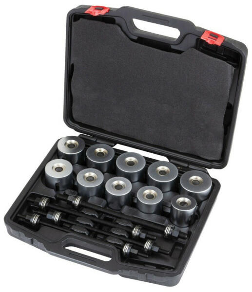 Univerzális szilent és csapágy ki-beszerelő készlet. Ezt az univerzális szerszámot szilent perselyek, hidraulikus perselyek, golyóscsapágyak, olajtömítések, gumi perselyek, stb. eltávolítására és beépítésére tervezték. A szerszámkészlet ideális többféle járműhöz, például autóhoz, terepjáróhoz, kisteherautóhoz, orsóval és hidraulikus műhely-sajtóval használh