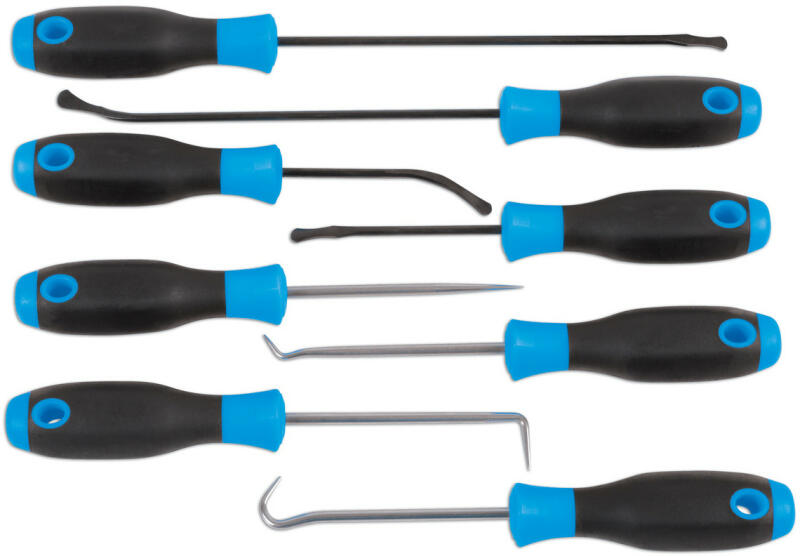 O-gyűrűk sérülésmentes eltávolításához. Gumírozott, puha, műanyag markolat. 8 különböző típus. A markolat végén lyukkal, a könnyebb tárolás érdekében. Tömeg: 1 kg Szín: fekete - kék Anyag: Chrome Vanadium acél