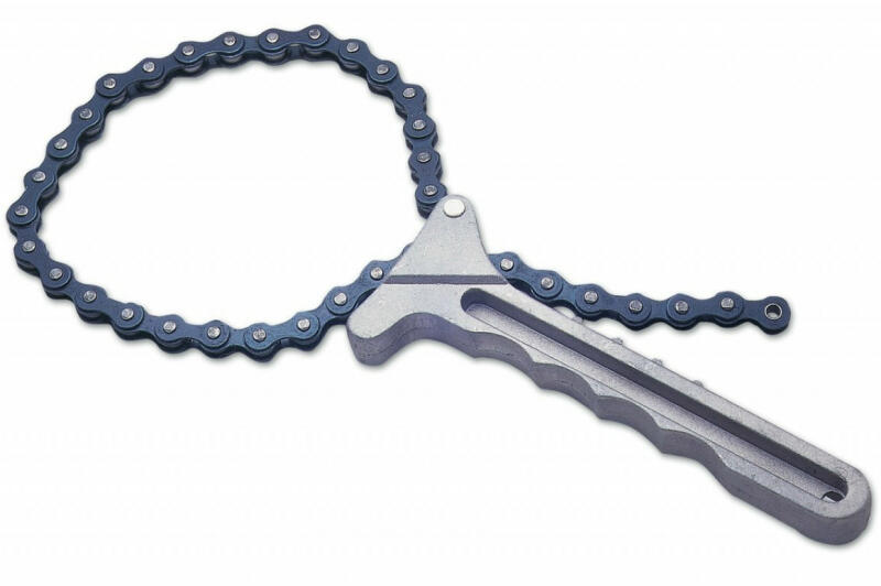Alumínium markolat. A lánc átmérője maximum 125 mm lehet. Önzáró mechanizmus. Könnyű súlyú kivitel. Hengeres alkatrészeknél használható. Súly: 244 g Szín: szürke-fekete Anyag: acél + alumínium