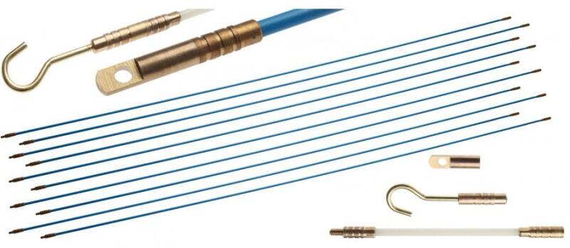ideális vezetékeléshez vezetékek és kábelek számára padlódeszka alatt menyezeti vezetékeknél fatörzseknél és falüregekben megerősített polyészterből készül beleértve a következő alkatrészeket: 10 üvegszál rúd hossza 1 méter Ø 4 mm ezzel létrehozható a max. 10 méter hosszúság 1 hajlékony bővítő 115 mm hosszú 1 nyomógyűrű 1 húzóhorog