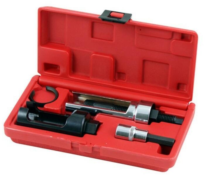 befecskendezőfej kihúzó készlet, 5 darabos. Kifejezetten a Mercedes CDI motorok nehezen kihúzható befecskendezőfejeinek (injektorok) eltávolítására tervezett termék. A készlet tartalma:- 29mm-es nyitott dugókulcs a porlasztó zárócsavarjának leszedéséhez. Meghajtás: 1/2"- 10-es lyukas (tamperproof) imbuszkulcs crowa foglalattal a porlasztó belső részének eltávolításához
