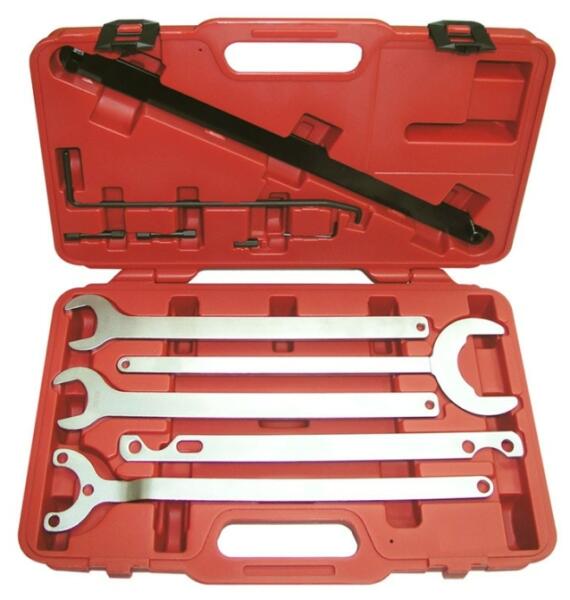Ventilátor kuplung vízpumpa kulcs készlet, 10 darabos. Alkalmas a viszkós vízpumpa hűtőventilátorok szereléséhez a Mercedes-Benz, BMW, Ford és GM (Opel, Vauxhall) járműveinél. Hosszú, vékony kialakítása lehetővé teszi a könnyű eltávolítást a megszorult, makacs menetekről is. A készlet egyaránt használható a szíjhajtás állítására, a rögzítő szíj oldására, a