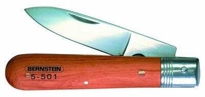 Kábelvágó kés Acél pengével, Fa betéttel és huzal hántoló. Műszaki adatok: Anyag: Acél · Méret, hossz: 200 mm · Penge hossz: 90 mm · Súly: 77 g
