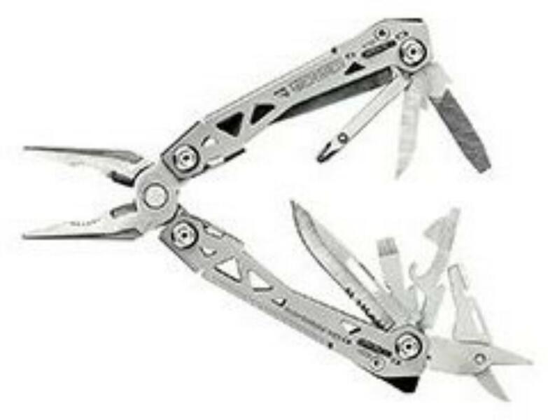Két kézzel nyitható kombinált szerszám, övcsipesszel. Tartalma: Philips csavarhúzó; nagy, lapos fejű csavarhúzó; kis, lapos fejű csavarhúzó; fogazott élű penge; sima élű penge; tartózsinórgyűrű; olló; üveg- és konzervnyitó; reszelő; drótvágó; rugós, hegyes fogó. A szerszámok biztonságos használatáról biztonsági zár gondoskodik. Teljes (nyitott) hossza: 15,9 c