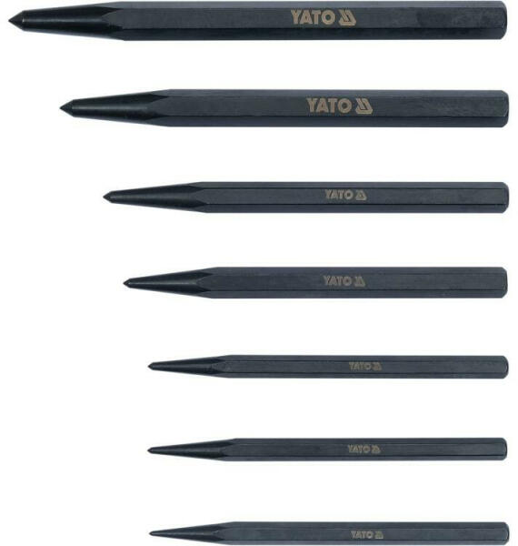 A Yato YT-47170 egy 7 darabos pontozó készlet , amely a következő elemeket tartalmazza: Pontozó - 1,5 mm x 100 mm Pontozó - 2 mm x 100 mm Pontozó - 2,5 mm x 100 mm Pontozó - 3 mm x 106 mm Pontozó - 4 mm x 110 mm Pontozó - 5 mm x 125 mm Pontozó - 6 mm x 140 mm Felhasználási területek : Ez a készlet ideális jelölési munkákhoz , például fémek megmunkálása során, ahol előfúr