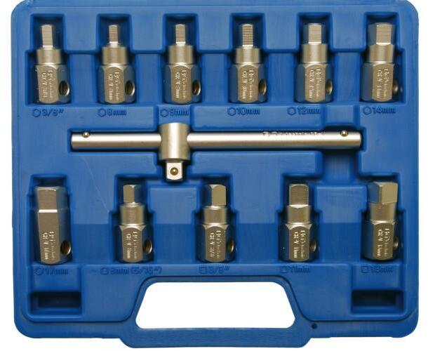7 db hatszögletű dugókulcs: 8-9-10-12-14-17 mm + 3/8" 4 négyzetes fejű dugókulcs: 8-11-13 mm +3/8" 1 csusztatható T-szár