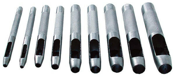 bőrlyukasztó klt. , műanyag tartóban; 9db, 2,5-10mm Bőrlyukasztó sorozat, bőrhöz, kartonhoz, rétegelt lemezhez, alulemezhez. Speciális acélból készült bőrlyukasztó készlet. Méretek: 2-3-4-5-6-7-8-9-10 mm