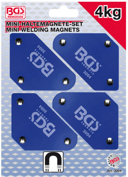 BGS Technic - Germany Miniatűr mágneses szögbeállító készlet 4 részes kiszerelésben Ideális: Fémlemezek és hegesztések pontos igazításához Tulajdonságok: - Anyaga: Acél - Teherbírás: 4 kg - Hosszúság: 72 mm - Szélesség: 43 mm - Magasság: 11 mm
