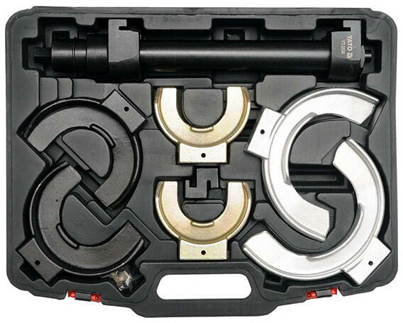 YATO YT-2536 Macpherson rugóösszehúzó cserélhető pofákkal Professzionális McPherson rugókihúzó cserélhető fogantyúkkal. A 7 részes készlet, a McPherson felfüggesztés lengéscsillapítóinak cseréjére szolgál. Az elszívó cserélhető fogantyúkkal rendelkezik, amelyek lehetővé teszik a 65-212 mm átmérőjű rugók kezelését. Anyaga: CrMo SCM415 ötvözött acél, foszfá