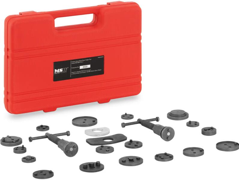 Az MSW BPCT-21.2 fékdugattyú visszanyomó szerszámkészlet professzionális megoldást kínál autószerelő műhelyekbe a különböző márkájú autók fékdugattyúinak javításához. Termékünk segítségével egyaránt szerelhet első és hátsó fékeket. Két menetes orsó és különféle adapterek lehetővé teszik a különféle fékmodelleken való könnyed munkavégzést. Az aut