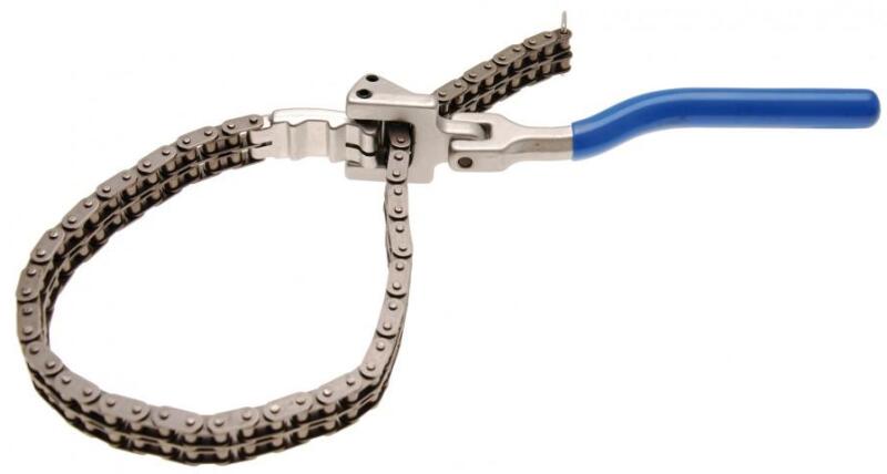 strapabíró szerszám duplex lánccal a lán kb. 22 mm széles a nyél szatén króm kivitel a köröm megelőzi a megcsúszást 180o forgatható nyél könnyű használni a speciális láncrögzítés miatt alkalmas olajszűrőkhöz 60 - 160 mm hossza 520 mm