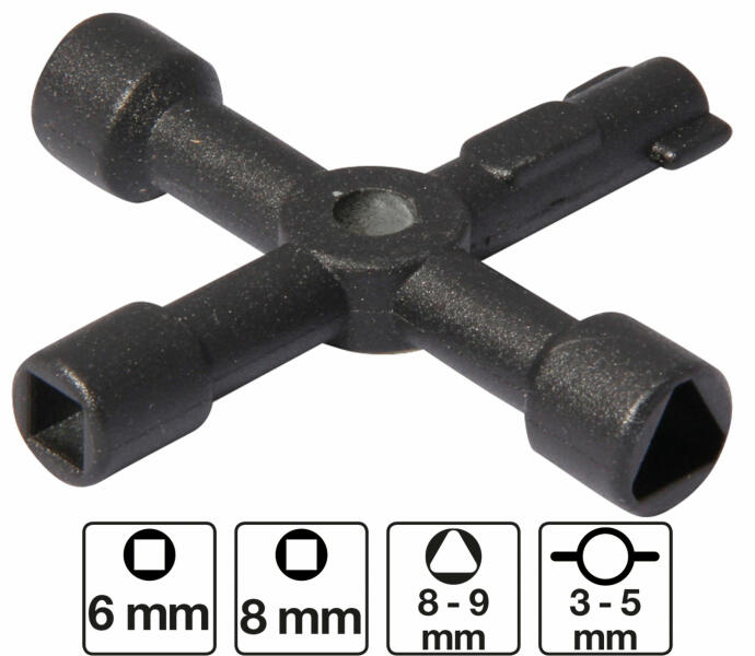 Kapcsolótáblák, vezérlőberendezések műszaki zárainak nyitására és zárására. Légkondicionáló, beléptető panelek, szolgáltatóajtók, utcai lámpák, szemetes kannák, kiszolgáló ajtóinak nyitására használható. Anyaga: acél Méretek: 72 x 72 mm Bruttó súly: 62 g Funkciók: Belső négyzet: 6 - 8 mm Belső háromszög: 8 - 9 mm Kéttollú: Ø 3 - 5 mm