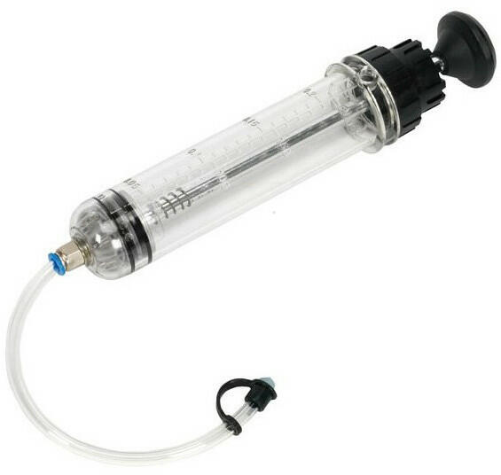 Folyadékok (pl. : fékfolyadék, fagyálló) betöltésére és leszívására használható fecskendő. Átlátszó tartály. Flexibilis tömlő végdugóval. Űrtartalom: 200 ml Anyag: műanyag + fém Tartály mérete: 290 mm Cső hossz: 210 mm