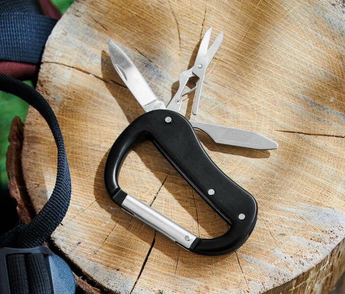 5 funkció: karabiner, olló, körömreszelő, palacknyitó és kés