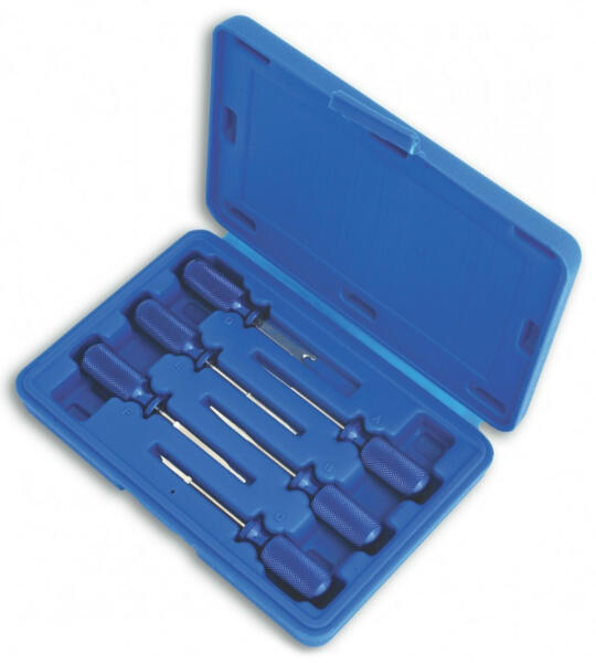 6 részes csatlakozó bontó szerszám készlet újabb autókhoz. Modernebb, apa csatlakozókhoz tervezett, speciális, több fajta méretű tűhegyekkel. Speciális, többféle profillal készítve a megfelelő, pontos használatért. Alkalmas váltóknál lévő csatlakozókhoz: Chrysler, Hyundai és Mitsubishi modellekhez. A motorháztető alján a hűtőfolyadék érzékelőknél: Chrysler, Mi