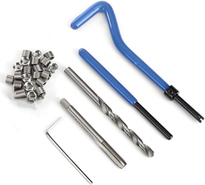 Sérült vagy elhasználódott menetek javításához. Tartalom: - 20 db betét M 8x1,25 mm - 1 db Csigafúró - 1 db Menetfúró 6x1.0 mm - 1 db Mini imbuszkulcs L alakú - 1 db Menetjavító betekerő - 1 db Fül letörő
