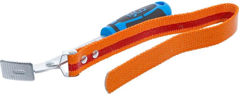 Erős, csúszásmentes szövetheveder Univerzálisan használható a könnyű beállításnak köszönhetően Olajszűrőkhö z és egyéb kerek csavaros csatlakozásokhoz 2 komponensű fogantyú Hevederhossz: 460 mm