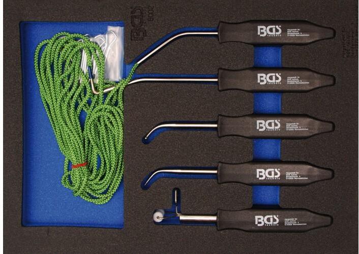 nem kötőanyaggal préselt/ragasztott szélvédőhöz beleértve a következő szerszámokat: markolat a behúzó fonat könnyű átirányításához golyós nyél 210 mm hajlított a tömítő gumi rongálás nélküli felemeléséhez horgos nyél 210 mm 45o hajlított és horgos nyél 270 mm 90o hajlított megkönnyíti a tömítő gumi behelyezését vezető nyél 220 mm a beépítő fonat kö
