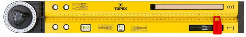 A TOPEX állítható szögmérő néhány mérőeszközt összeházasító szerszám. Része a 0°- 270° tartományú szögmérő, az 500 mm hosszú vízmérték két libellával, az 50 cm-es acélvonalzó, és ceruza is rögzíthető rá, így körzőként is használható. A szorítócsavar megkönnyíti a szögmérést. A TOPEX márka ezermestereknek készül.
