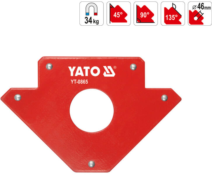 YATO Mágneses szögbeállító, erős mágnesekkel ellátva. Kiváló segítség a hegesztésnél, előre beállított szögállásokkal. Tulajdonságok: - Mágnes kapacitás: 34 kg - Gyári szögek: 45° - 90° - 135° - Középrész átmérő:46 mm Súly: 1,13 kg