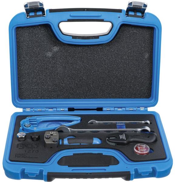 Felszerelt fékvezetékeken is használható Rézből, alumíniumból és acélból készült fékvezetékekhez Peremező szerszám 4,75 mm-es (3/16") fékvezetékek DIN F típus szerinti peremezésére Racsnis fékvezetékvágó 4,75 mm (3/16") fékvezetékek vágásához, a teljes szerszám teljes elforgatása a fékvezeték körül Csőhajlító fogó 3 mm, 4,75 mm és 6 mm átmérőjű vezeté
