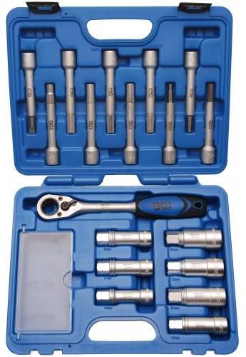 használható a legismertebb járműveknél a lengéscsillapító javítási munkáihoz és a lengéscsillapító dugattyú rögzítéséhez beleértve: racsnis visszafordítható belső hatszöű dugókulcsok 122 mm hosszú 16-17-18-19-21-22-24 mm dugókulcsok belső hatszöggel 122 mm hosszú 6-7-8 mm speciális dugókulcsok (ovális) 122 mm hosszú 5x8 - 6x8 - 7,1x9,6 mm pl. Porsche Cayenne VW