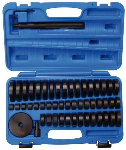 alkalmas csapágyak tömítőgyűrűk és gumizott gyűrűk szereléséhez különösen hasznos használni hidraulikus préssel ez a készlet magában foglalja a szerelő betéteket a következő méretekben: 18-tól 65 mm-ig (1 mm-es lépcsőkkel) és 74 mm 12 mm Ø furat 180 mm fém nyél a kalapáccsal való használathoz szénacélból készül