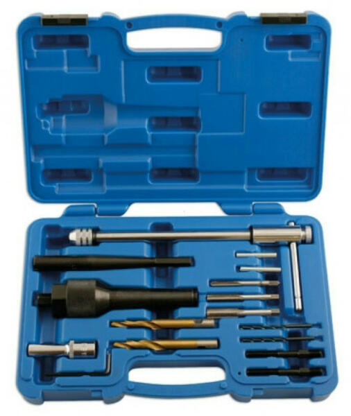 A hibás vagy beszorult, esetleg repedt és beletört izzítógyertyák kiszerelésére használható szerszámkészlet. Különösen hasznos, ha az izzítóhegy a hatlapú csavaranyánál eltört. Használható: M8 x 1.0-es és M10 x 1.0-es izzítógyertyákhoz. Speciális acél fúrószár és edzett acél szerszám kiegészítők. Komplett kiszerelő készlet. A hengerfej levétele nélkül has